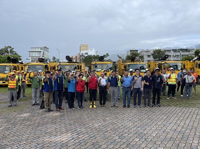 張局長進一步說,此次來台東沿途看到不少路樹傾倒等環境受災狀況,恢復市容環境著實需要不少機具及人力投入處理,雖然中央氣象局今日針對台東地區發布豪雨特報,現場天候狀況不太穩定,高雄團隊人員及機具仍全力配合台東縣環保局任務分配,分別前往台東市、東河鄉、卑南鄉、鹿野鄉、池上鄉、關山鎮、長濱鄉及成功鎮等8個鄉鎮市馳援,同步展開環境清理工作,把握風雨空檔加速進行環境清理工作,持續與台東縣政府緊密配合、攜手合作,期以最快速度讓台東民眾恢復正常生活。