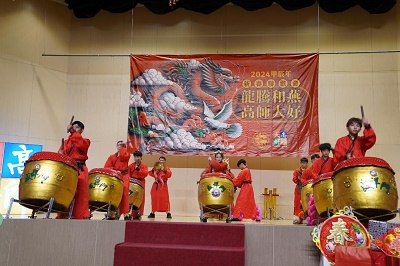 【記者吉雄世/高雄報導】國立高雄師範大學於2月17日上午9時30分,在和平校區活動中心2樓演藝廳,舉行新春團拜暨摸彩活動,校長王政彥在副校長唐硯漁與李昭蓉等陪同下親自主持,歷任校長黃正鵠、戴嘉南、蔡培村、吳連賞、王代理校長惠亮及副校長柳賢等連袂出席盛會。邀請張偉鈺老師與張琬瑩老師擔任節目主持人。活動開始在盛祥門龍獅戰鼓團精湛表演後,由校長王政彥率領二位副校長及主管們,向在場及線上教職員工與退休同仁拜年。緊接著傳來天籟之音-高師大愛樂合唱團;高獅大好-盛祥門龍獅戰鼓團;龍飛鳳舞帶動跳-朱冠霖老師等精彩表演,並穿插緊張、刺激的摸彩活動。