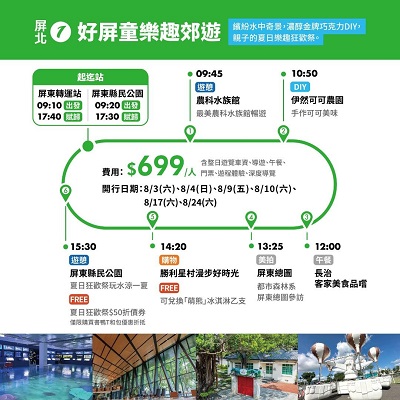 首波開賣三條郵輪巴士遊程,有主打親子旅遊放電的「好屏童樂趣郊遊」路線、夏日清涼消暑的「二峰圳人文走讀」,以及體驗屏南半島精彩遊程的「琅嶠牡丹尋訪記」,內容包含在地特色午餐、手作DIY、在地深度導覽解說等豐富精彩內容,帶領遊客輕鬆穿梭各景點,適合全家暑假一同出遊。