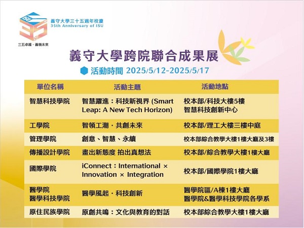 跨院聯合成果展於5月12日至5月17日舉行,「智慧科技學院」以「智慧躍進:科技新視界(Smart Leap: A New Tech Horizon)」為主題,展示資通訊技術結合創新系統設計,展區位於科技大樓五樓智慧科技創新中心,是科技與創意整合的前哨站。「工學院」以「智領工潮・共創未來」為題,於理工大樓三樓中庭展出,呈現學生在工程實作與研發領域的成果。「管理學院」則以「創意・智慧・永續」為展覽核心,在綜合教學大樓一樓與三樓展出學生管理企劃案與飲調、廚藝美學實作成果,從中傳遞創意、智慧及永續概念。「傳播設計學院」結合動靜態展演推出「畫出新態度 拍出真想法」展區,展示影像敘事、視覺設計與多媒體創作。「國際學院」的展覽為「iConnect:International × Innovation × Integration」融合語言、文化與全球視野,呈現學生的國際專業與整合思維。「醫學院」與「醫學科技學院」聯合策展「醫學風起・科技創新」,於醫學院A棟及各學系學展區展示智慧醫療設備等應用,體現義守大學在健康科技領域的領先地位。「原住民族學院」則推出具人文溫度的主題「原創共鳴:文化與教育的對話」,展區位於綜合教學大樓一樓大廳,運用圖文、影音、實體文物與工藝品等多元媒材,建構一個具有層次感與互動性的展覽空間,讓觀展者能夠從視覺、感官、情感等多面向,深入感受原住民族文化的深度、廣度與多樣性。