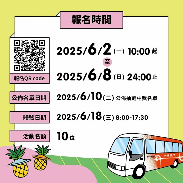 為落實環教推廣,活動優先錄取具備環境教育實務經驗或相關背景之報名者,報名時須檢附證明文件,並採抽籤決定最終名單。報名期限自即日起至6月8日止,抽籤結果將於6月10日公布。屏東縣政府誠摯邀請熱愛學習、樂活不老的您,一同搭上這班知性又樂趣滿載的環教郵輪巴士!