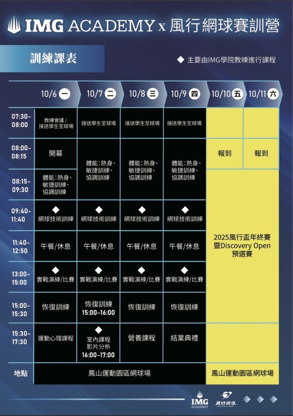 本次來台進行的主教練 Weylu Chang 曾擔任WTA 莫妮卡-塞萊斯以及杉山愛的陪練教練,目前是IMG學院男子網球項目的負責人,而該學院曾培養出多位世界級網球選手,如錦織圭、鄭欽文、莎拉波娃及大小威廉絲等,素有『世界冠軍的搖籃』的美譽。這也是IMG學院首次在台舉辦網球訓練營,並在營隊結束後緊接著搭配「2025風行盃年終賽暨Discovery Open預選賽」,讓參加的選手有機會在台灣取得赴美參加Discovery Open的選手資格及接受IMG高水準訓練,與全球頂尖青少年選手一較高下,若能在Discovery Open中勝出,則可以以外卡身份參加ITC錦標賽。