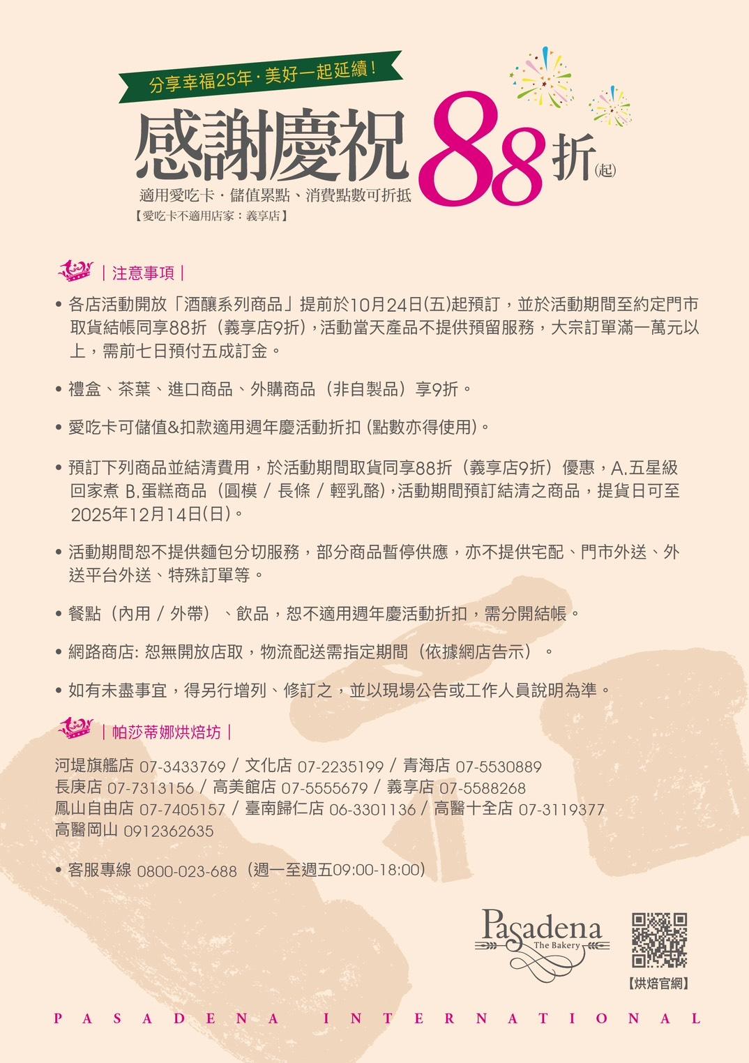 帕莎蒂娜烘焙坊25週年慶 分享幸福・美好一起延續! 88折適用愛吃卡·儲值累點、消費點數可折抵