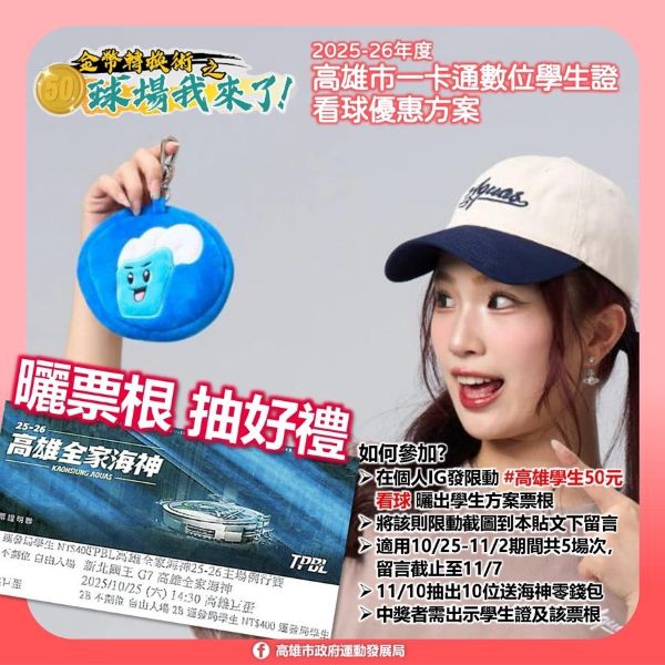 另外,今年高雄市政府「學生50元看球優惠方案」10月22日起開放預約,凡持一卡通數位學生證的高雄市國小、國中、高中職及大專院校學生,都能以50元入場觀賞原價300至400元的職業籃球賽事。海神隊全季主場都在優惠範圍內,10月22日起開放預約,名額有限。運發局提醒,學生只要憑證件購票即可輕鬆入場,歡迎年輕球迷把握機會,親自到場體驗海神主場的熱血氛圍,加入藍色浪潮,一起成為海神最強後盾,高雄市17所大專院校學生及高中職以下非記名數位學生證者,請攜帶學校核發的實體學生證現場驗證購買當日場次,每場數量有限,售完為止,詳情請參閱活動網頁 https://i-pass.co/6lq94e ,更多賽事資訊,請上高雄市政府運動發展局臉書(https://www.facebook.com/ksdkcg)查詢。