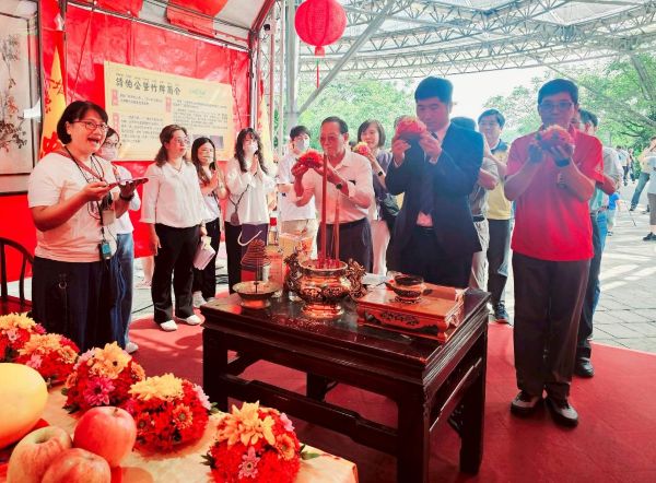 圖5 :千人共下打粢粑六堆秋收祭開幕式,由邱星崴副主委帶領貴賓向竹田忠義祠六堆忠義亭忠勇公王及以傳統竹牌重現奉請12鄉區伯公代表至六堆園區賜福民眾。