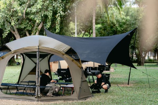 期間限定的露營活動讓大義公園變身戶外風格十足的露營區,集結8家露營品牌與5輛特色露營車,讓民眾探索戶外生活的各種提案,一覽各式露營用品與配件,同時安排多組樂團和劇團接力演出,豐富露營時光。若想活動筋骨,現場設有走繩運動體驗區;若想釋放壓力,可報名「瑜悅運動」的夜間舒緩瑜伽課,與頌缽、泰北敲筋、藥草球按摩等療癒體驗。此外,也推出露營技巧、自然手作及親子互動等主題課程,讓親朋好友共享戶外時光。