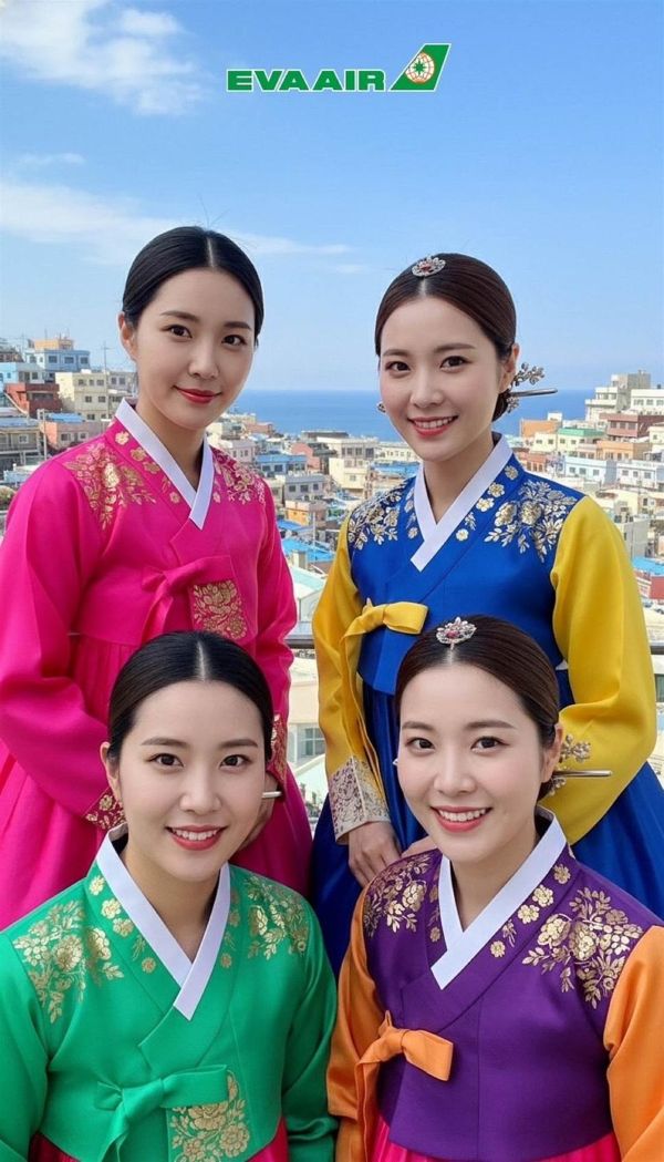 圖說五、六:為慶祝長榮航空在今年開航達拉斯及釜山,展場特別設置「AI生成拍照區」讓民眾一秒化身成帥氣的牛仔及體驗韓服風情。(上圖)空服員示範使用「AI生成拍照」(下圖)立刻身穿韓服置身當地美景。