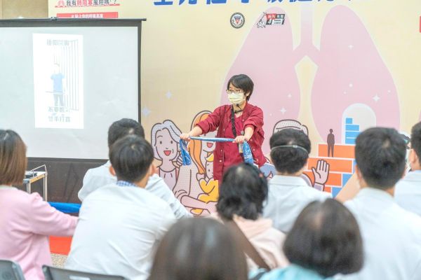 圖說5:從主題展覽、闖關體驗到醫師講座,高醫以多元方式帶領民眾認識呼吸疾病,一起「看見呼吸的重要」。活動中,高醫慢性阻塞性肺病團隊也帶領病友與民眾進行毛巾伸展操,以實作方式學習正確的呼吸與日常保健。