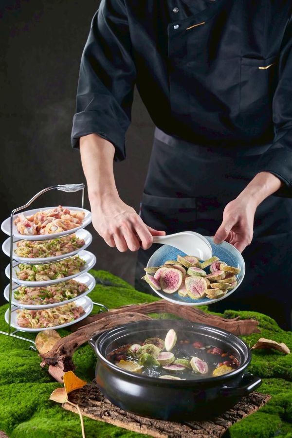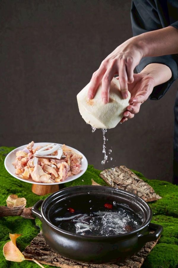 雞煲鍋底:這款湯底選用本地脆皮鸡肉質緊實;搭配地中海進口的優質無花果和多種神秘藥材,一起放入鍋中經過數小時慢火熬煮,口感清甜,鲜而不腻,帶有無花果獨特的果香。去骨脆皮鶏肉:精選當天現宰脆皮雞純手工剔骨取肉切片,口感鮮嫩多汁,湯底沸騰唰煮10-15秒即可食用。