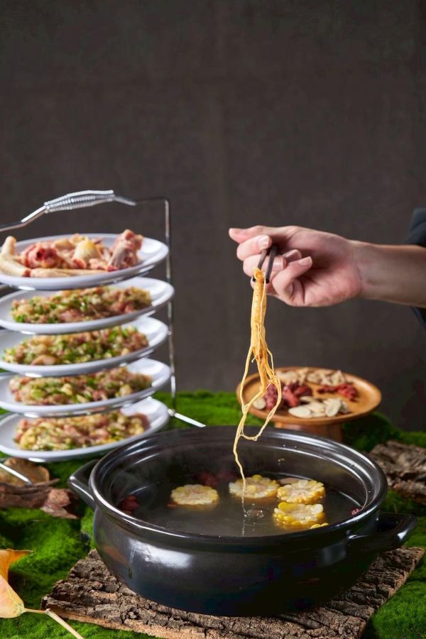 鮮人參鍋底::這款湯底我們用一整根新鮮人參與脆皮雞以及其他神秘藥材一起熬煮,鮮人參屬性溫和,湯味是鮮中帶甜,沒有藥味,非常好接受。