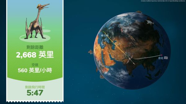 圖說二、三:全新3D飛行地圖最特別的獨家功能,為家庭旅遊量身打造兒童探索模式,讓兒童可以與風神翼龍一同沿著飛行路徑,探索更多恐龍身影,兼顧知識及趣味性。