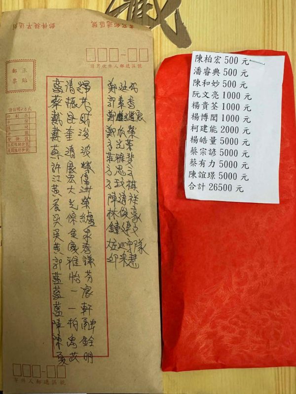 藍所長聽聞後心生憐憫,自掏腰包及協調民間善心人士蔡振茂、戴昆財、戴奎浚、蘇清波、許展榮、江宏偉、黃大洲、詹光榮、吳倧纑、黃慶春、吳金泉、郭雅謙、藍怡芬、藍一宸、藍一軒、陳柏融、陳禹銓、夏苡明、鄭延成、郭素香、鄭繼宸、鄭欣榮、方光榮、莊雅斐、方思云、方玟棋、陳清祥、林俊豪、鍾進文、邱采慧、大庄巡守隊等人,共同捐款新臺幣(以下同)3萬4,000元;另由民間善心團體陳柏宏等人捐助2萬6,500元,合計善款總額6萬500元整。在東海派出所內親將善款交付張父,期盼透過這份溫暖的心意,暫時紓解其燃眉之急,協助其渡過人生難關。