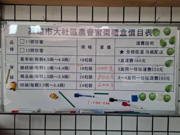 大社蜜棗禮盒公定售價:總統級(每顆4.5兩-4.9兩)18粒裝1000元/盒、精品級(每顆4.0兩-4.4兩) 20粒裝800元/盒、特級(每顆3.0兩-3.4兩) 24粒裝600元/盒。運費另計。