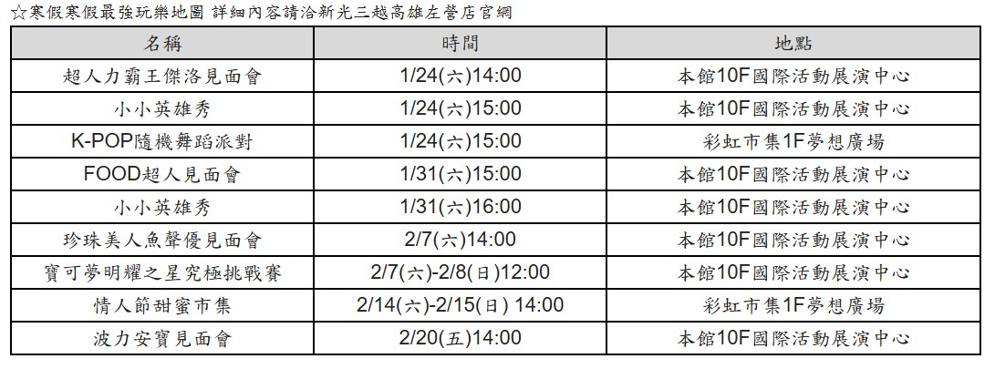 看準寒假檔期人潮,新光三越高雄左營店同步推出「最強企劃-寒假玩樂護照」,專屬會員為親子家庭客群打造寒假吃喝玩樂地圖攻略,除話題展覽持續吸引年輕族群外,寒假期間也陸續推出深受小朋友喜愛的 FOOD 超人見面會、超人力霸王見面會及POLI見面會,讓親子族群能近距離互動拍照,親子行程一次搞定! 餐飲方面亦同步升級,話題鍋物品牌 「這一小鍋」 與人氣日系拉麵 「屯京拉麵」(1月13日開幕)於彩虹市集4F盛大登場,為寒假來客帶來更多元的用餐選擇。