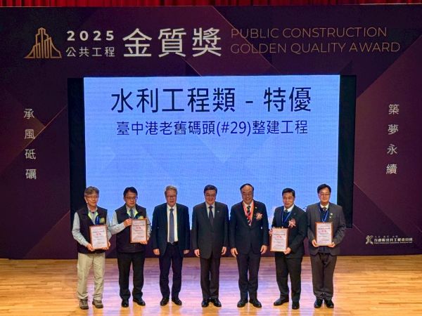 【記者吉雄世/高雄報導】行政院公共工程委員會於115年1月21日舉辦「第25屆公共工程金質獎」頒獎典禮,特邀行政院卓榮泰院長蒞臨頒獎。臺灣港務公司秉持「安全、品質、永續」的工程核心理念,於本屆公共工程金質獎再創佳績,以「臺中港老舊碼頭(#29)整建工程」榮獲特優獎,「花蓮港#17~#25碼頭震災修復工程」榮獲優等獎,由周永暉董事長代表領獎。公共工程金質獎為國內公共工程最高榮譽獎項,本次獲獎充分展現臺灣港務公司在工程品質、施工管理及創新技術應用上的卓越成果。