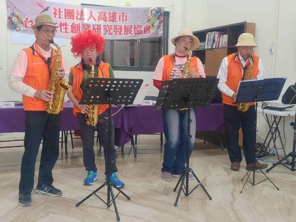 在捐贈儀式中,「金色女聲合唱團」也前來獻聲,演唱了「聽海」、「愛神的箭」等曲目。美妙繚亮的歌聲將現場變成一個小小的音樂會。另外,「女創管樂團」也特別安排薩克斯風及二胡等多種樂器表演,演奏「甜蜜蜜」、「望春風」等歌曲,呈現出音樂關懷的溫柔形式。悠揚的旋律在雷特氏症高雄市社區關懷據點中流轉,為在場的社區關懷據點長輩帶來輕鬆愉悅的時刻,也讓現場充滿安定、溫暖的氛圍。