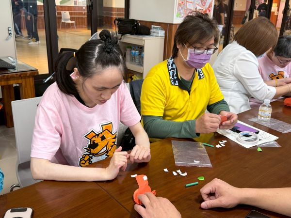 扶輪社友們化身志工,陪伴身心障礙朋友,度過溫馨的手作時光。在創作過程中,有人動作較慢,也有人因為肢體障礙,較難完成細緻步驟,社友們皆耐心陪伴,一步步引導他們完成作品。經過剪裁和黏貼後,原本一張張的色紙,變成了一顆顆立體橘子。看著作品成形,每個人都感到滿滿的成就感。接著,大家把「福」字貼在橘子上,為作品增添年節氛圍。