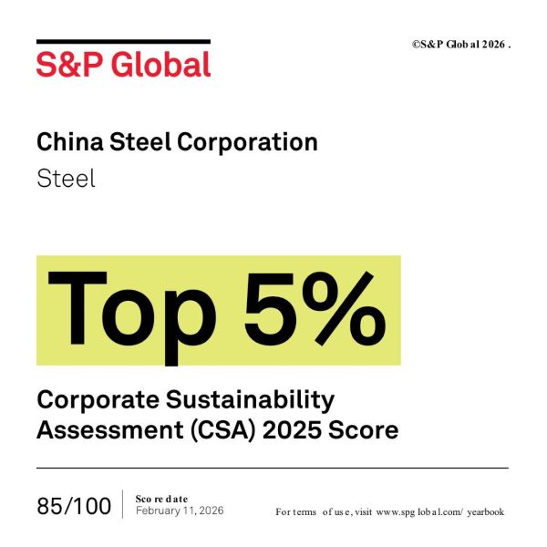 【記者吉雄世/高雄報導】國際永續評比機構標普全球(S&P Global)日前公布入選《2026年標普全球永續年鑑》(S&P Global Sustainability Yearbook 2026)名單,中鋼2025年企業永續評比(Corporate Sustainability Assessment, CSA)成績名列前茅,以全球鋼鐵業第二名之姿,榮獲《2026年標普全球永續年鑑》Top 5%殊榮。另外,中鋼連續15年參與S&P Global CSA評比,也獲頒《參與S&P Global CSA 15週年》紀念徽章,以表彰中鋼全力推動永續發展的決心與行動力。