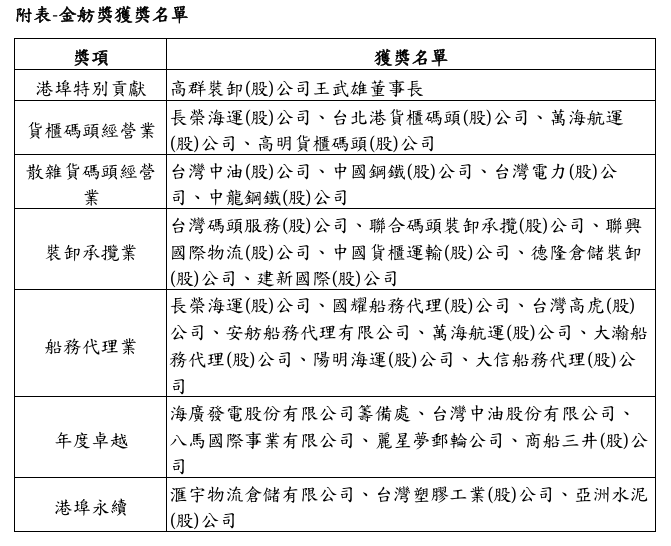 港務公司同步舉辦金舫獎頒獎典禮,表揚貨櫃碼頭經營、散雜貨碼頭經營、裝卸承攬、船務代理、港埠永續及年度卓越等領域共計30家港區績優業者,今年更首度頒發「港埠特別貢獻獎」,由高群裝卸公司王武雄董事長獲獎,以表彰其長年深耕航港領域,推動產業進步之卓越貢獻。王武雄董事長是促成高雄港成為倫敦金屬交易所(LME)在台唯一非鐵金屬遞交港的重要推手,並成功打造高雄港為國際紙漿發貨基地,對提升自由貿易港區營運量能及帶動產業發展,貢獻卓越。