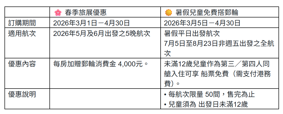 其中,最受親子家庭關注的「暑假兒童免費搭郵輪」專案,適用於7月5日至8月23日期間非週五出發之暑假平日全航次。凡未滿12歲兒童與父母同行,即可享船票免費優惠,讓家庭旅客能以更輕鬆的方式規劃暑假海上假期。相關航程優惠價格每人每晚 3,600 元起,被市場視為今年暑假最具吸引力的親子郵輪產品之一。