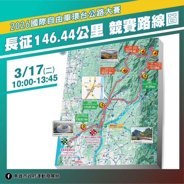 【記者吉雄世/高雄報導】國際自由車總會UCI登錄1級賽事「2026國際自由車環台賽高雄站」將於115年3月17日舉辦,高雄站起點選擇於世界著名佛光山佛陀紀念館出發,沿途行經11個行政區,為確保賽事順利進行以及保障市民、行人安全,賽事所經道路將逐區進行階段性路段管制,敬請高雄市民朋友留意交通管制資訊。