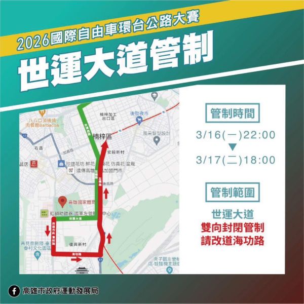 八、 世運大道為終點區,預計3月16日晚上10時至3月17日下午6時雙向封閉管制,請改走海功路。
