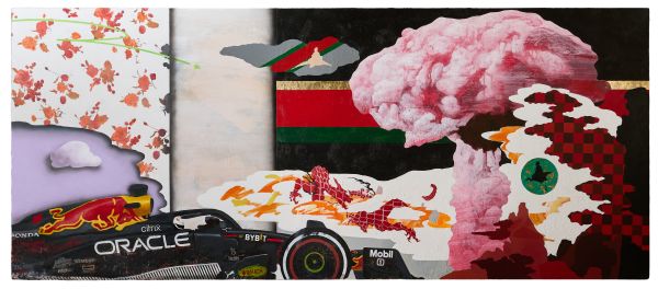 圖說1:2026高雄藝術博覽會的「潛龍特展」將呈現臺東美展、中山青年藝術獎得主葉哲瑀的作品《假仙境 越界神馳》(110 x 258 cm,金箔、花布、壓克力彩、油彩、木板裱麻布,2025)