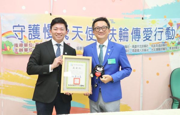圖1: 高雄市五福扶輪社展現大愛,由潘劭偉社長(左)帶領社員代表捐贈獎學金幫助高雄市12位低收腦麻學子。