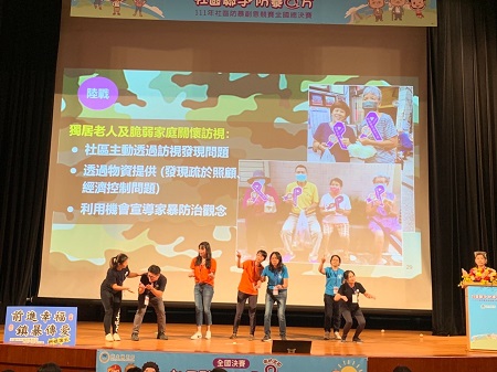 【記者吉雄世/高雄報導】衛福部9月17日於台北市公務人力發展中心福華國際文教會館舉辦「街坊出招8」社區防暴創意全國總決賽。原本有19個社區參加競賽,經北、中、南區複賽後,有9個社區進入全國總決賽,來自高雄、基隆、新北、苗栗、彰化、台東、宜蘭等縣市,每支隊伍都是從分區脫穎而出,高雄市前鎮幸福興東社區發展協會,以「前進幸福 鎮暴傳愛」-社區防暴陸海空策略,突顯在大樓林立、人情淡薄的都會型區域如何喚起民眾重視家庭暴力議題,深獲評審青睞,榮獲全國第2名殊榮。