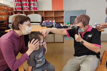 有些不容易好好坐著的幼童,使用輔具來協助檢測,也有的幼童仍然對眼睛檢查機器感到陌生,害怕的流下了眼淚,還好有充滿耐心與細心的老師與視光師安撫,順利讓孩子們完成檢查。