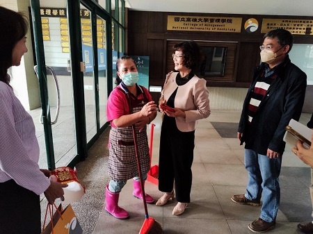 【記者吉雄世/高雄報導】新年新氣象,國立高雄大學校長陳月端2月1日率領行政團隊至各學院、行政處室走春拜年,致贈教職員生「揚眉兔氣」 開運紅包,感謝過去1年齊心打拼,更祝福開工大吉好彩頭,校運昌隆、兔飛猛進再創新局。